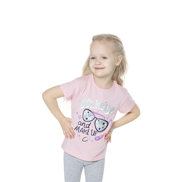 Эластичная легкая футболка нежно-розового цвета станет излюбленной вещью в гардеробе каждой модницы. В составе ткани использован натуральный хлопок с добавление эластана. Это не только дарит комфорт в носке, но и защищает кожу от перегрева и чудесно садится на фигуру любого типа. Короткие рукава не сковывают движений во время игр. Завершает нежный девичий образ забавный принт с надписями, дополненными очками и косметикой. Благодаря нежному цвету футболка органично дополнит повседневный или домашний образ. Рекомендовано для детей ясельного возраста.