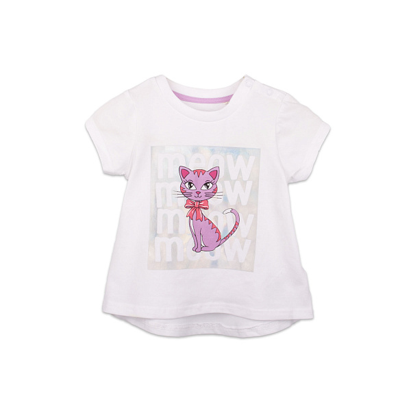 Футболка свободного кроя украшена оригинальным ярким рисунком с изображением забавной кошечки. Такая модель предназначена для девочки, а также дополнена специальной застежкой на плече. фуфайка гармонично дополнит летний гардероб маленькой модницы, а также будет удачно сочетаться с летними брючками, шортами и юбками. Для пошива использован тонкий трикотаж из 100% хлопка. Материал создает условия для естественной вентиляции, обеспечивает комфорт в жаркий день и препятствует потоотделению. Изделие стойко переносит частые стирки, не садится, не растягивается, долгое время сохраняет эстетичный внешний вид. Рекомендовано для детей ясельного возраста.