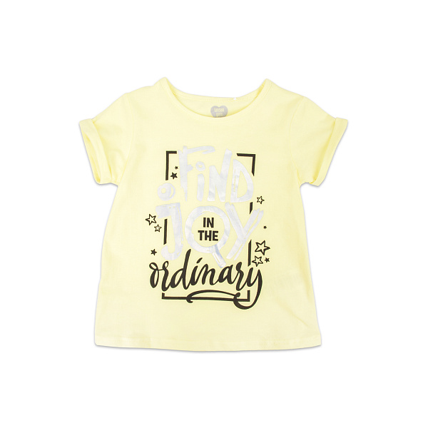 Футболка для девочек в городском стиле сшита из нежного хлопкового трикотажа желтого цвета. В качестве декоративного оформления использована мотивирующая печатная надпись черного и серебряного цветов. Короткие рукава с отворотными манжетами делают футболку модной и привлекательной для детского глаза. Горловина при этом обработана бейкой. Изделие чудесно лежит на детской фигуре благодаря современному фасону и включению в состав ткани волокон эластана. В составе ткани использовано 95% хлопка, поэтому ткань приятна к телу, не вызывает раздражения, чудесно вентилируется. Рекомендовано для детей дошкольного и школьного возраста.
