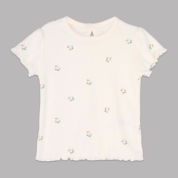 Дизайн футболки украшен нежным цветочным принтом на светлом фоне, что придает изделию романтичный и свежий вид. Короткие рукава и круглый вырез горловины создают классический силуэт, который идеально подходит как для повседневной носки, так и для более особых случаев.