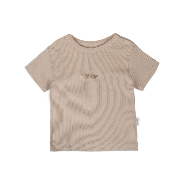 Футболка с коротким рукавом для девочки сшита из натуральной хлопковой ткани рибана в рубчик. Хлопковые ткани значительно меньше вызывают аллергические реакции и раздражения на коже детей, поэтому чаще всего детскую одежду шьют именно из хлопка. Кроме того, такая ткань хорошо выдерживает многочисленные стирки и быстро высыхает, что облегчает уход за одеждой малыша. Удобная фуфайка из мягкой и приятной на ощупь ткани имеет две застежки-кнопки на левом плече, благодаря этому она легко надевается и снимается. Спереди светло-коричневая фуфайка украшена вышивкой в виде сердца с крыльями.