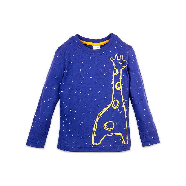 Лонгслив с длинным рукавом и стилизованным изображением жирафа станет незаменимым предметом гардероба малышей. Малыш по достоинству оценит арт и даже сможет похвастать перед друзьями. Лонгслив синего цвета чудесно подойдет к одежде любой цветовой гаммы. Рукав не имеет манжета, он оформлен подгибным швом. Белые полоски нанесены методом печати на полотно, как и изображение жирафа. Шов горловины на изнаночной стороне усилен бейкой.
