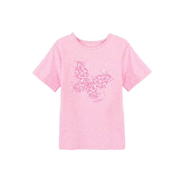Футболка розового цвета украшена нежным принтом в виде бабочки. Модель имеет классический силуэт, короткий рукав, предназначена для девочки дошкольного или школьного возраста. Изделие гармонично сочетается с торжественными и повседневными джинсами, брюками, юбками и шортами, чудесно подходит для жаркой погоды. Для пошива использован мягкие и приятный на ощупь трикотаж, в составе которого 92% хлопка, 5% эластана, 3% ПЭ. Такой материал не мешает естественной циркуляции воздуха, быстро впитывает влагу, не растягивается и не выгорает на солнце. Ткань стойко переносит частую стирку, долгое время сохраняет привлекательный внешний вид.
