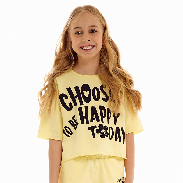 Кофта желтого цвета с позитивной надписью на английском языке на груди. Рукава и подол майки не обработаны, что придает им легкую небрежность. Можно носить отдельно или поддеть под футболку топик, чтобы сделать образ еще интересней. Такой наряд подойдет для прогулок, занятий спортом или современными танцами.