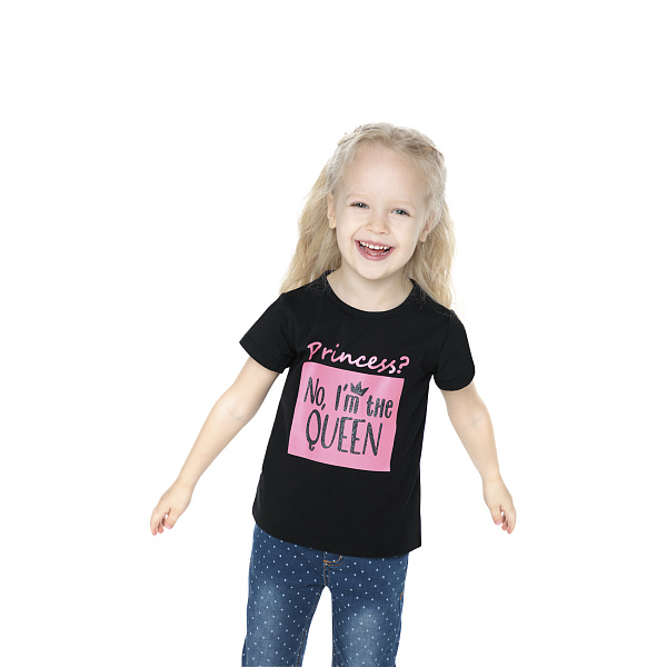 Футболка с коротким рукавом оформлена в контрастных тонах. Сочетание сочного розового изображения и черного фона делают футболку практичной и привлекательной в глазах малышки. Изделие предназначено для маленькой девочки, поэтому оно отличается свободным кроем. Для пошива использован приятный на ощупь трикотаж из 100% хлопка. Такой материал устойчив к износу и истиранию, чудесно пропускает воздух, не мнется и быстро сохнет. Фуфайка создает комфортные условия для малышки даже в сильную жару. Предварительная стирка обязательна. Рекомендовано для детей ясельного возраста.
