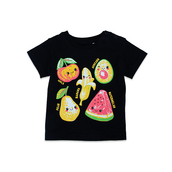 Черная легкая футболка с изображением ярких тропических фруктов удачно завершит любой образ ребенка. В составе ткани использован хлопок и небольшим добавлением эластана, благодаря чему футболка легко растягивается и садится на любую фигуру. Хлопок при этом обеспечивает естественную вентиляцию и препятствует появлению пота, поэтому родители могут не переживать, что нежная детская кожа покраснеет и начнет зудеть. На плечике для комфортного использования присутствуют прочные заклепки, благодаря которым можно легко переодеть ребенка и сменить наряд.