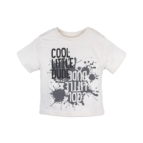 Светлая повседневная хлопковая футболка для мальчиков. У майки короткие рукава и свободный крой. На груди изображена картинка в виде зеркально отображенной надписи на английском языке и крупных серых клякс. В такой модной кофте будет сложно остаться незамеченным.