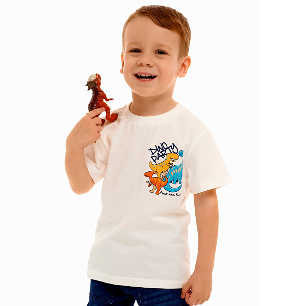 Трикотаж приятен на ощупь, быстро сохнет после стирки и обеспечивает хорошую терморегуляцию на прогулке в жаркий летний день. Спереди футболка украшена небольшим рисунком с тремя забавными динозаврами, а на спине изображено еще больше разноцветных динозавров, устроивших веселую вечеринку с песнями и танцами.