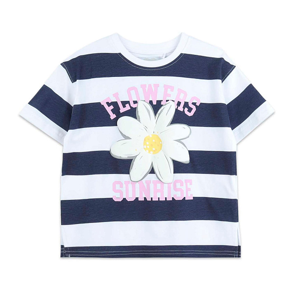 Разнообразить привычный детский гардероб поможет эта яркая футболка с коротким рукавом для девочек. Модель в горизонтальную полоску с крупным рисунком цветка на груди. Классический круглый ворот и свободный крой не ограничивают и не стесняют движения малыша.