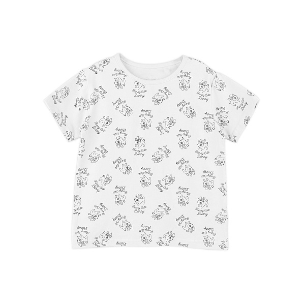 Футболка с коротким рукавом для девочки на каждый день. У ткани спокойный бежевый оттенок, который хорошо сочетается с разными вариантами и цветами в одежде. Футболка будет одинокого хорошо смотреться и с шортами, и с юбкой. Милый орнамент в виде мультяшных зайцев делает ее более девчачьей и добавляет образу нежности.