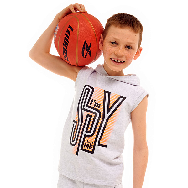 Тонкая трикотажная ткань светлого серого цвета быстро сохнет, она приятна на ощупь и комфортна для тела. Спереди футболка украшена крупной надписью на английском языке в черно-рыжих тонах. Удобный капюшон поможет защитить ребенка от легкого дождика или палящего солнца.