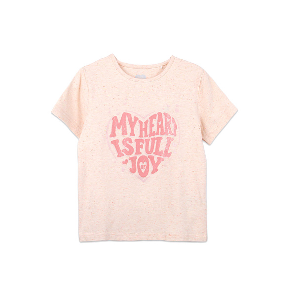 Повседневная футболка с коротким рукавом для девочки. Выполненная в нежном персиковом цвете, она дополнит летний гардероб, добавив красок в обычные образы. Футболка сшита из хлопкового материала с добавлением синтетики (92% хлопок, 3% эластан, 5% полиэстер). У нее свободный фасон. Ткань неоднородного цвета, есть дополнительный рисунок, напоминающий мелкие брызги краски. На груди большая надпись на английском языке, размещенная в сердечке.