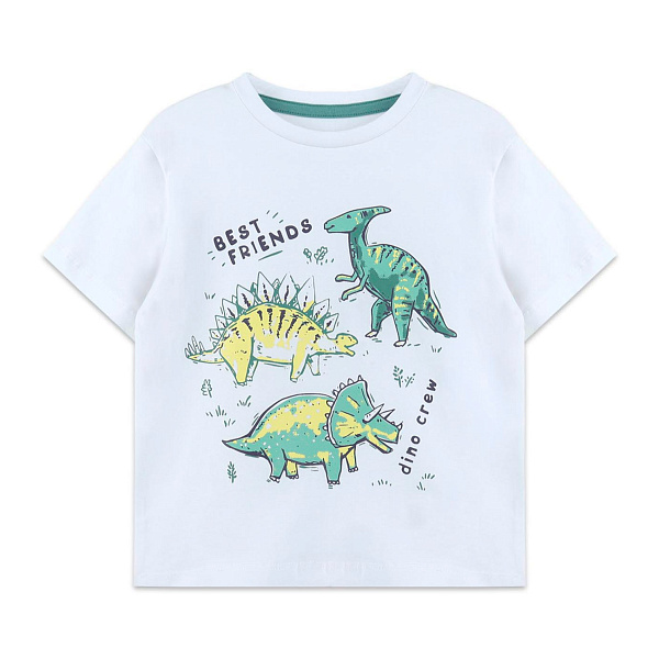 Футболка выполнена в белом цвете, на груди изображены динозавры и надпись. Белые футболки подходят под любой лук, поскольку сочетаются с одеждой различных оттенков. Они могут использоваться как домашняя, выходная, прогулочная одежда, или выполнять роль нательного белья.