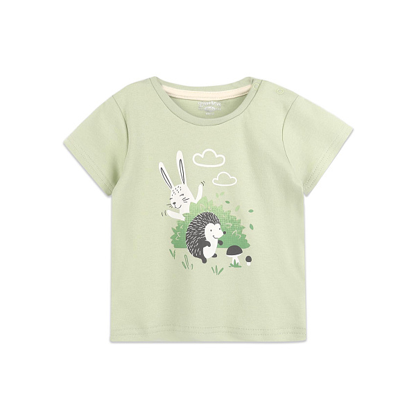 Лучше всего футболка подойдет в качестве повседневной домашней одежды. Цвет изделия – светло зеленый. Такая гамма успокаивающе действует на малыша. На груди имеется изображение ежика и зайца на лесной полянке.