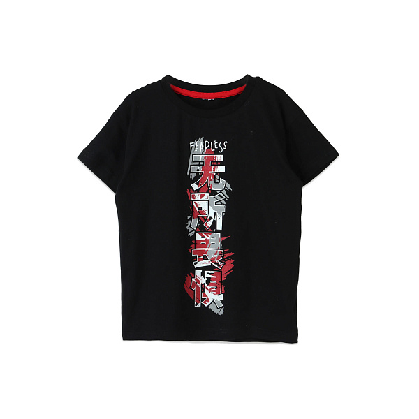 Стильная футболка с коротким рукавом понравится любому мальчику, органично впишется в его летний гардероб. Ребенок будет в восторге от иероглифов, нанесенных на переднюю часть изделия. Свободный крой и широкий ворот гарантируют комфорт, свободу движений и положительные эмоции. Не возникнет никаких затруднений в процессе переодевания.