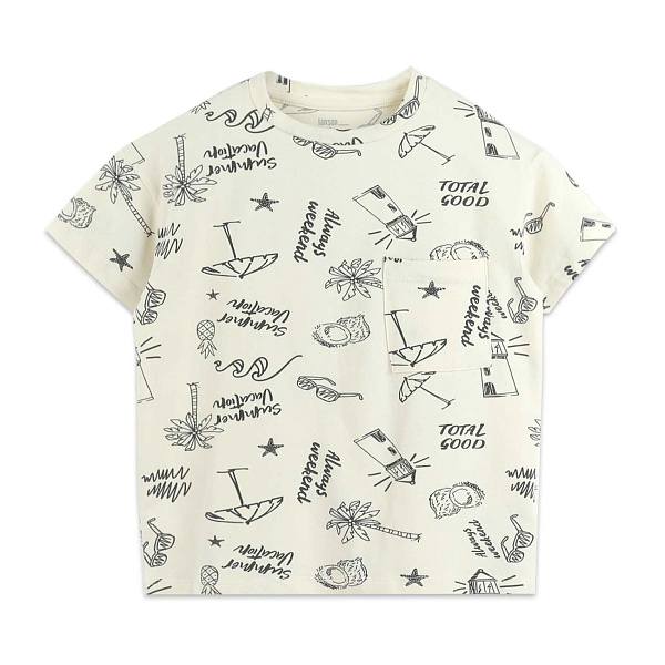 Легкая повседневная футболка с коротким рукавом для мальчиков. Изделие отлично подойдет для поездки на море или прогулок в жаркую летнюю погоду. Модель в светлом бежевом оттенке с тематическим рисунком в виде пальм, кокосов и пляжных зонтиков. Сидит свободно, не ограничивая движения ребенка.