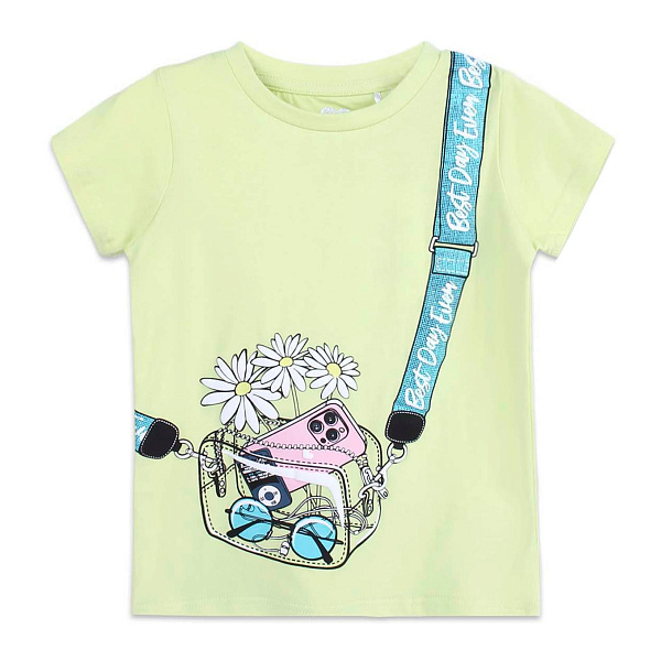 Эта оригинальная футболка для девочек сразу привлекает к себе внимание. Модель с коротким рукавом выполнена в ярком желтом цвете с необычным рисунком, изображающим наплечную сумочку. У изделия круглый вырез и свободный крой. В такой футболке ребенок будет чувствовать себя комфортно и в процессе спокойной прогулки, и во время активных игр с друзьями.