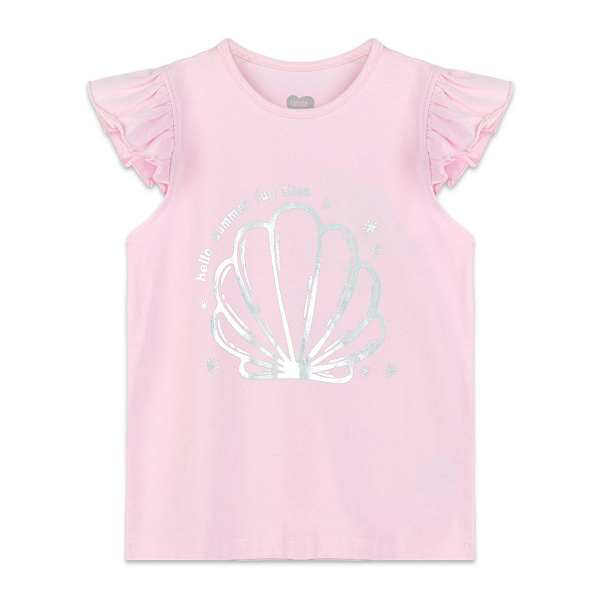 Детская майка розового цвета изготовлена из 100% хлопка, что делает её мягкой и комфортной для кожи ребенка. На передней стороне изделия расположен принт в стиле металлик в виде ракушки, окруженный звездочками и надписью. Рукава украшены элегантными оборками, добавляющими игривости и стиля образу.