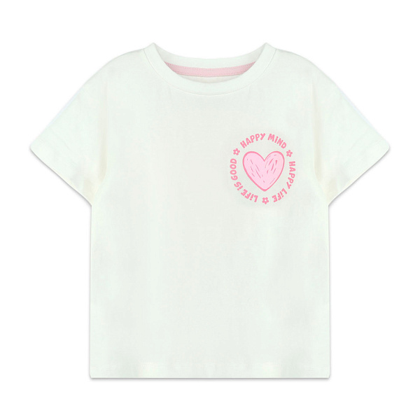 Детская футболка для девочки изготовлена из 100% хлопка, который обеспечивает комфортное ношение и дышащие свойства материала. Светлая одежда украшена крупным розовым принтом в виде сердца с надписью по кругу, что придает одежде позитивное и вдохновляющее настроение. Принт дублируется и на спине.