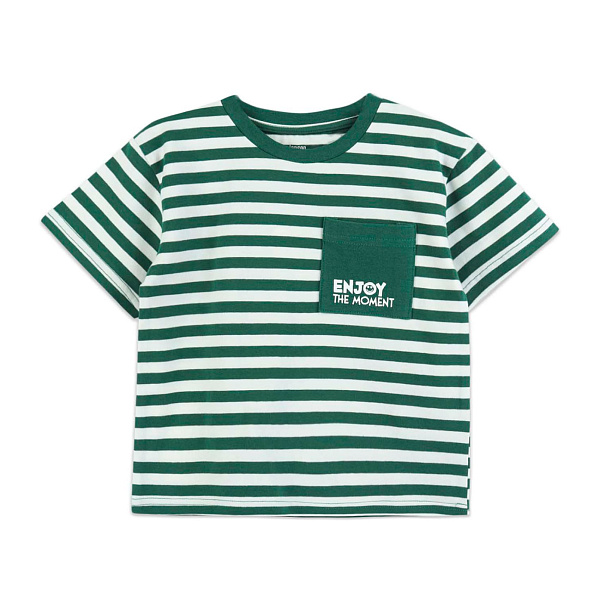Полосатая футболка с коротким рукавом украшена однотонным накладным карманом с надписью. Изображение нанесено методом термопечати, эффектно контрастирует с фоном. Модель прямого кроя обеспечит ребенку комфорт и свободу движений, не создаст проблем в процессе переодевания. Она органично впишется в сезонный гардероб, позволит придумать массу стильных образов.