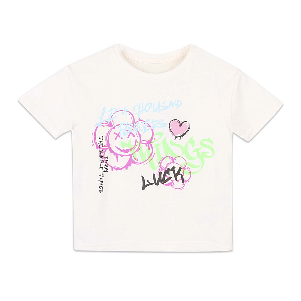 Дизайн футболки отличается ярким и креативным принтом, выполненным в жизнерадостных цветах. Такой акцент добавляет оригинальности и стиля, делая ее привлекательной для молодых модниц. Классический белый цвет служит отличной базой для яркого рисунка, подчеркивая его детали. В размерах до 80 предусмотрены кнопки у горлышка для удобства переодевания.