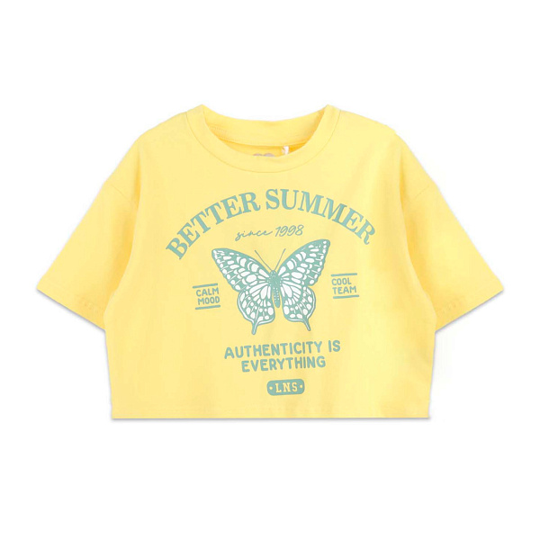 Яркая и стильная футболка с коротким рукавом для девочек. Это универсальная повседневная модель. У нее укороченная длина и свободный крой. Малышка наверняка оценит насыщенный желтый цвет и модный рисунок с бабочкой. Изделие свободно сидит и не стесняя движения. Носить можно как самостоятельную вещь, так и в комплекте с классическим топом.