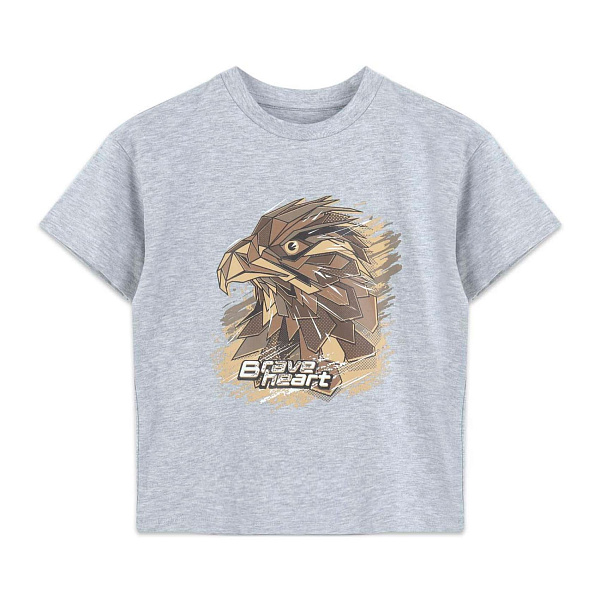 Универсальная хлопковая футболка для мальчиков. Модель с коротким рукавом. Изготовлена в сером цвете с изображением головы орла на груди. Изделие свободного кроя с классическим круглым горлом. В ней малышу будет одинаково удобно на игровой площадке, на отдыхе или на занятиях в спортивной секции. Футболка не ограничивает движения ребенка. Ее классическая цветовая гамма сочетается с разными стилями и оттенками одежды.