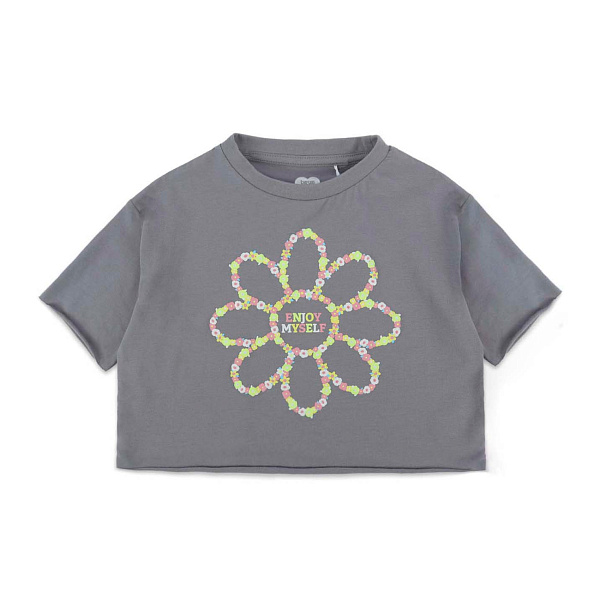 Детская футболка с коротким рукавом для девочек. Это укороченная модель свободного кроя. Она удобно сидит, не мешает активным играм и не стесняет движения ребенка. Выполнена в сером цвете с рисунком в виде контрастного желтого цветка на груди. Такой кроп-топ можно носить отдельно или надевать как верхний слой на классический топ с тонкими бретельками. Будет одинаково хорошо сочетаться с юбками, шортами и штанами.