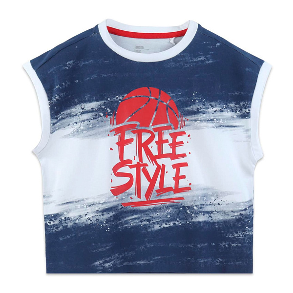 Цвет изделия – темно-синий с белой полосой посередине. Границы между белой полосой и темным фоном размытые. Такой дизайнерский прием используется для эффектного внешнего вида. На груди имеется текстовой принт и стилизованный баскетбольный мяч красного цвета.