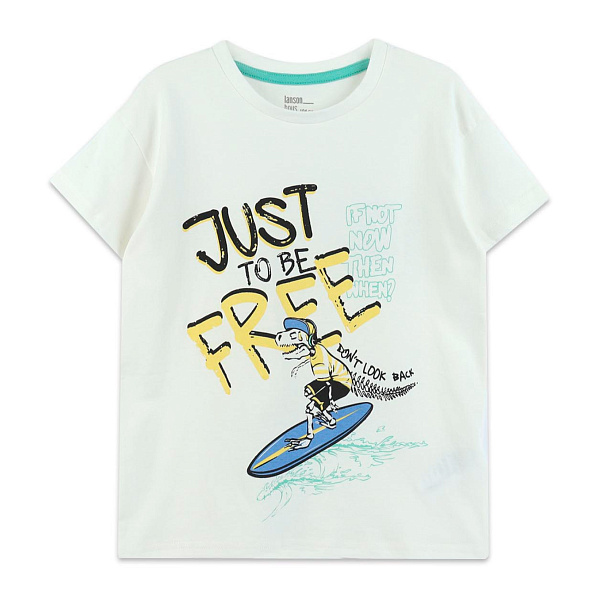 Футболка выполнена в белом цвете, на передней части размещен принт с изображением скелета динозавра на серфе и надписью.