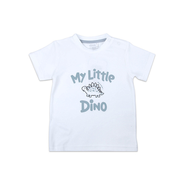 Нарядная футболка с коротким рукавом подчеркнет трогательный образ маленького мальчика. Модель имеет классический прямой крой и застежку на плече. Таким образом удается предельно упростить процесс переодевания, обеспечить свободу движений. Украшением служит изображение динозавра, нанесенное на грудь методом современной термопечати.