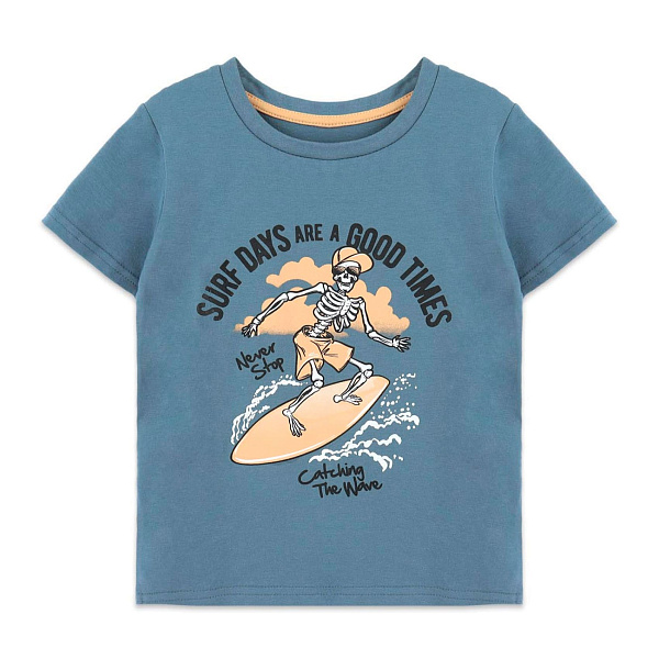 Изделие имеет короткие рукава и свободный крой, не стесняющий движений. Цвет модели – темно-синий, на передней части имеется изображение скелета на серфе и надпись.