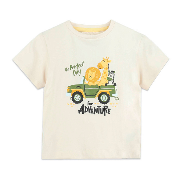 Удобная летняя футболка с коротким рукавом для мальчиков. Модель светлого бежевого оттенка с милым рисунком в виде африканских зверей, спешащих в путешествие на своем зеленом джипе. У изделия свободный, не ограничивающий движения крой. Малыш будет чувствовать себя комфортно и сможет принимать активное участие в играх с друзьями.