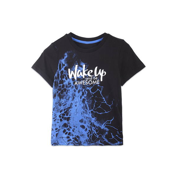 Хлопковая футболка с коротким рукавом для мальчика. Модель классического кроя. Выполнена в черном цвете с большим и ярким абстрактным рисунком в синем оттенке с белой надписью. Сидит свободно, не мешает активным играм и не ограничивает движения. Будет хорошо смотреться с джинсами, спортивными штанами или шортами. Материал натуральный, без добавления примесей. Гипоаллергенный и полностью безопасный для ребенка. При правильном уходе долго сохраняет первоначальный привлекательный внешний вид.