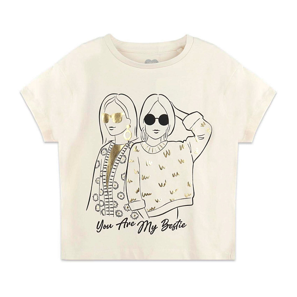 Футболка с коротким рукавом для девочек – это классический вариант одежды на лето. Модель бежевого цвета с рисунком в виде стильных девушек на груди. Изделие с круглым воротом и свободной посадкой. Майка удобна в носке, не мешает играм с друзьями и не стесняет движения.