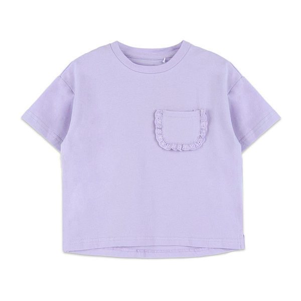 Ткань изделия идеально подходит как под возраст ребенка, так и под климат сезона. В ее составе содержится только 100% хлопок без примеси синтетики. Футболка имеет прямой крой, короткие рукава и круглый вырез горловины. На груди пришит накладной кармашек.