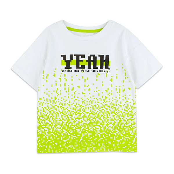 Футболка совместима со спортивной, прогулочной, выходной одеждой и обувью. Цвет изделия – белый, низ декорирован россыпью ярко-зеленых точек, покрывающих большую часть поверхности. На груди имеется черный текстовый принт.
