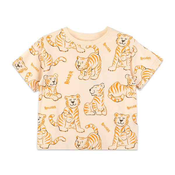 Круглая горловина отделала бейкой, а рукава и низ футболки подшиты фабричным швом. Одежда легко надевается и снимается через голову, поэтому сборы на прогулку будут не очень долгими. Симпатичный рисунок в виде добрых и дружелюбных тигров в разных позах понравится не только самому мальчику, но и окружающим.