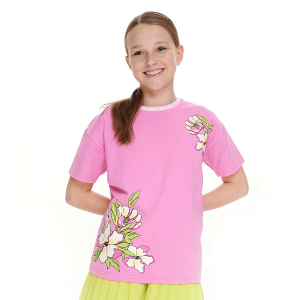 Футболка для девочек изготовлена из 100% хлопка, что делает ее мягкой и приятной на ощупь. Натуральный материал обеспечивает отличную вентиляцию и комфорт при носке, особенно в теплую погоду. Розовый цвет изделия подчеркнут ярким цветочным принтом, который придает образу жизнерадостность и стиль.