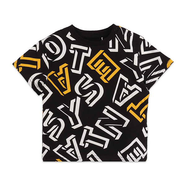 Цветовое оформление: на черном фоне изображены большие буквы белого и оранжевого цветов. Футболка хорошо сочетается с шортами или летними брюками. В ней ребенку очень удобно играть как в помещении, так и на улице.