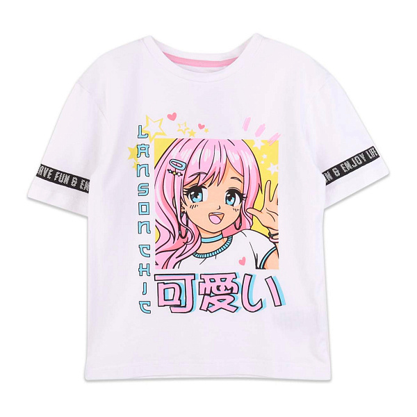 Футболка имеет короткие рукава, свободный крой и надевается через голову. Круглый вырез горловины отделан трикотажным кантом. Изделие выполнено в белом цвете, декорировано крупным принтом с изображением модной девочки в японском стиле. Рукава дополнительно украшены черными полосками, создающими стильный контраст. Футболку можно использовать для повседневной носки.