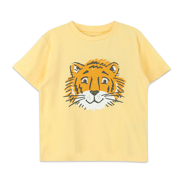 По-летнему яркая и веселая футболка для мальчиков с коротким рукавом и круглым вырезом. Изделие удобного свободного кроя. Она комфортно сидит на теле и не стесняет движение ребенка. Модель желтого цвета. Спереди ее украшает милый рисунок в виде веселой морды тигра. Отлично впишется в детский летний гардероб. Будет сочетаться и с брюками, и с шортами.