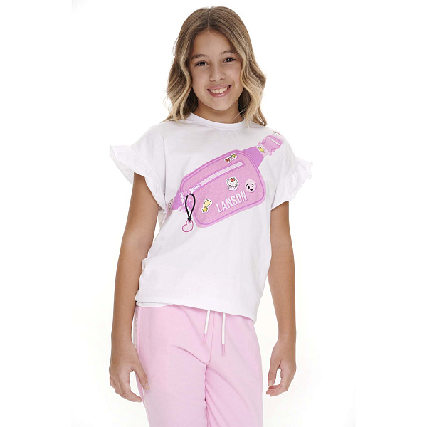 Белая футболка для девочек изготовлена из 100% хлопка, что обеспечивает комфорт и мягкость при носке. Однотонный базовый цвет изделия дополняется ярким декоративным элементом в виде рисунка модной розовой сумки.