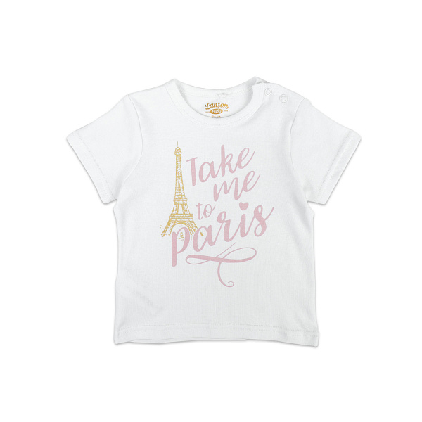 Белая трикотажная футболка дополнит гардероб маленькой модницы. Нежная и приятная на ощупь ткань пошита из натурального хлопка, она хорошо пропускает воздух и позволят коже дышать, обеспечивая сухость в процессе носки. Свободный крой и короткие рукава не сковывают движения. Вырез горловины круглый и дополнен застежкой в виде кнопок – с их помощью можно легко переодеть малышку, не доставляя дискомфорта. Перед футболки дополнен мечтательным принтом с Эйфелевой башней и розовой надписью «Take me to Paris». Рекомендовано для детей ясельного возраста.