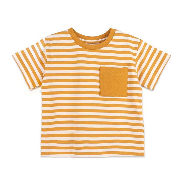 Футболка имеет короткие рукава, классический прямой крой с круглым вырезом горловины и средним размером длины. Горловина обработана эластичной тесьмой, поэтому ребенок легко просовывает через нее голову.