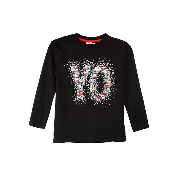 Порадовать ребенка можно не только игрушками, но и стильными вещами. Черного цвета лонгслив внесет разнообразие в гардероб ребенка, а также добавит акцент в его образы. Черная ткань выполнена на основе натурального хлопка, она мягкая на ощупь и приятная к телу, хорошо пропускает воздух и дарит комфорт в процессе носки. Крой кофты свободный, поэтому движения ребенка не будут скованны. Рукава без манжет, вырез горловины круглый, воротник отсутствует. Лицевая сторона дополнена принтом с надписью «YO», буквы которой состоят из множества слов. Рекомендовано для детей дошкольного и школьного возраста.