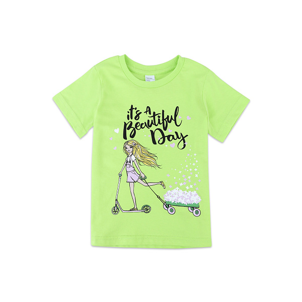 Футболка с круглым вырезом станет достойным пополнением в гардеробе каждого ребенка. Произведена из хлопка и небольшой доли эластана, она имеет плотную посадку на любом типе фигуры. Тщательно обработанные швы и точные линии рисунка спереди изделия не расползаются после численных стирок, и не теряют свою первозданную форму. Гармонично смотрится при сочетании со спортивной формой, а также в тандеме с полуспортивной одеждой. На фоне зеленого цвета имеется яркий рисунок в виде девочки с самокатом и колоритная надпись, добавляющая изюминки изделию. Рекомендовано для детей ясельного возраста.