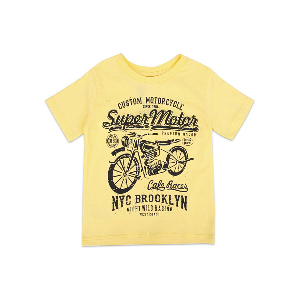 Спокойного желтого цвета футболка станет любимой вещью в гардеробе ребенка. В составе ткани использован натуральный хлопок, который хорошо проводит воздух и не дает телу перегреться. Свободный крой и короткие рукава не стесняют движений в процессе носки, добавляя комфорта. Украшает футболку большой контрастный принт мотоцикла с надписями. Такая футболка чудесно подойдет для активного отдыха на пляже, занятий спортом и повседневных образов.