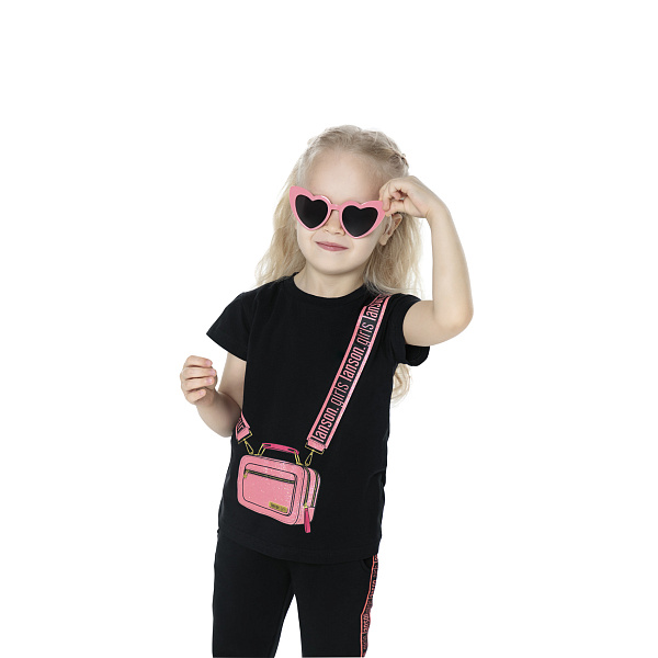 Летняя фуфайка с коротким втачным рукавом для девочек окрашена в темный цвет и декорирована оригинальным принтом в форме наброшенной через плечо женской сумочки яркого розового цвета. Фуфайка, которая предназначен для детей ясельного возраста, выглядит модно и подходит к одежде городского или спортивного стиля. Майка чудесно сидит на фигуре благодаря небольшому включению эластана в состав ткани. При этом сам трикотаж состоит на 95% из натурального хлопка, который обеспечивает высокие санитарно-гигиенические показатели состояния кожи при носке. Фуфайка приведет в восторг маленьких модниц ясельного возраста.