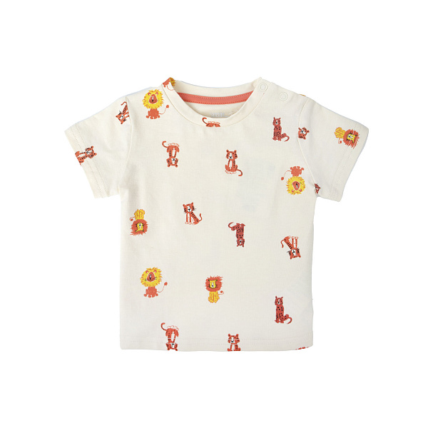Футболка для малыша молочного цвета с принтом в виде фигурок хищных животных подойдет для малышей в жаркую летнюю погоду. Футболка надевается через голову, а для большего комфорта на плече футболки сделана прочная кнопочная застежка. Мягкое трикотажное полотно изделия на 95% состоит из натурального хлопка, который проявляет свои антисептические свойства даже в изделии. Хлопок препятствует развитию бактерий и грибка на детской коже в условиях жары и влажности. Футболка чудесно стирается и подходит для ежедневного использования малышам ясельного возраста.
